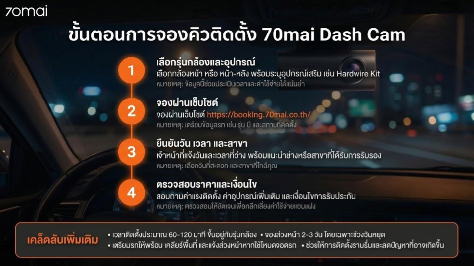- ลูกค้าสามารถจองบริการติดตั้งผ่านช่องทางที่สะดวก ได้แก่ เว็บไซต์ https://booking.70mai.co.th/ โดยควรเตรียมข้อมูลรถ รุ่น ปี และสถานที่ติดตั้งให้ครบถ้วน