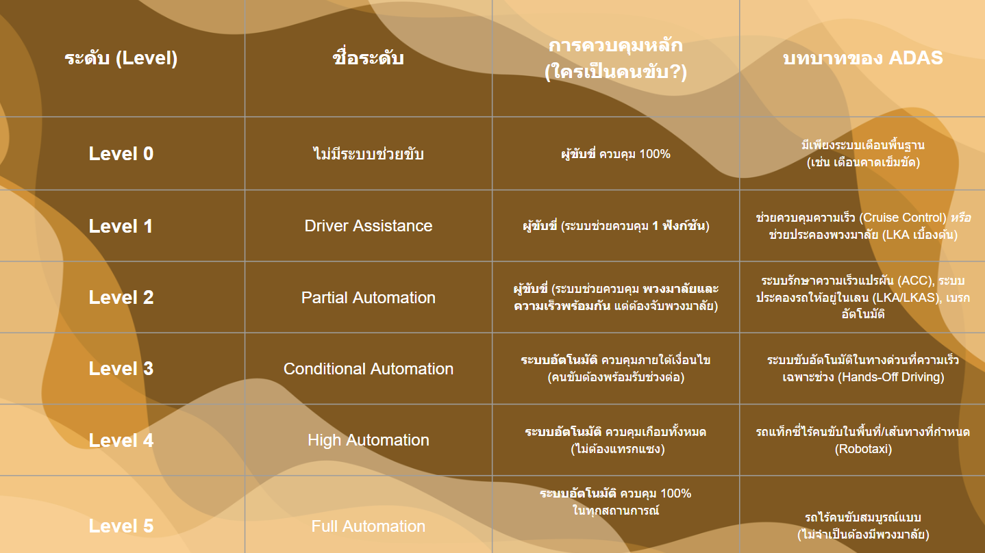 ระดับการขับขี่อัตโนมัติของ ADAS ตั้งแต่ Level 0–Level 5